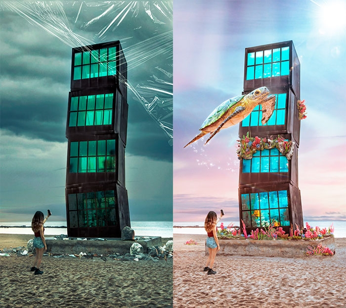 Custom Landmarker es una nueva función que permite a los creadores anclar las Lentes a los lugares locales que les interesan (desde estatuas a edificios o escaparates), para contar historias más enriquecedoras sobre sus comunidades a través de la Realidad Aumentada. Ahora, los Snapchatters que se encuentran en la playa de la Barceloneta tienen la posibilidad de abrir la Cámara de Snapchat y, situándose al pie del L'Estel Ferit, escanear el monumento para desbloquear la lente, descubriendo un acuario mágico, con el cual pueden interactuar, donde las especies marinas prosperan o desaparecen según la cantidad de basura en la playa. Al mover el cursor hacia arriba, aparece una tortuga marina gigante, una de las especies más afectadas por la basura, nadando alrededor del Snapchatter.