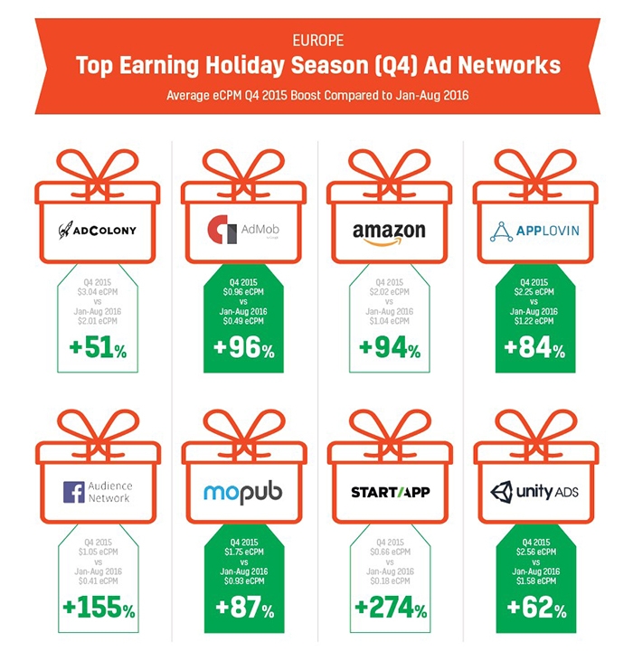 Las redes publicitarias más eficaces en este periodo promocional son Amazon ads, Mopub, Ad Colony, Admob y Startapp y, en general, durante octubre, noviembre y diciembre, el coste efectivo por cada mil impresiones (eCPM) aumenta exponencialmente en todas ellas. Admob aumenta sus ganancias generadas un 96% y Mopub un 87%, por ejemplo.