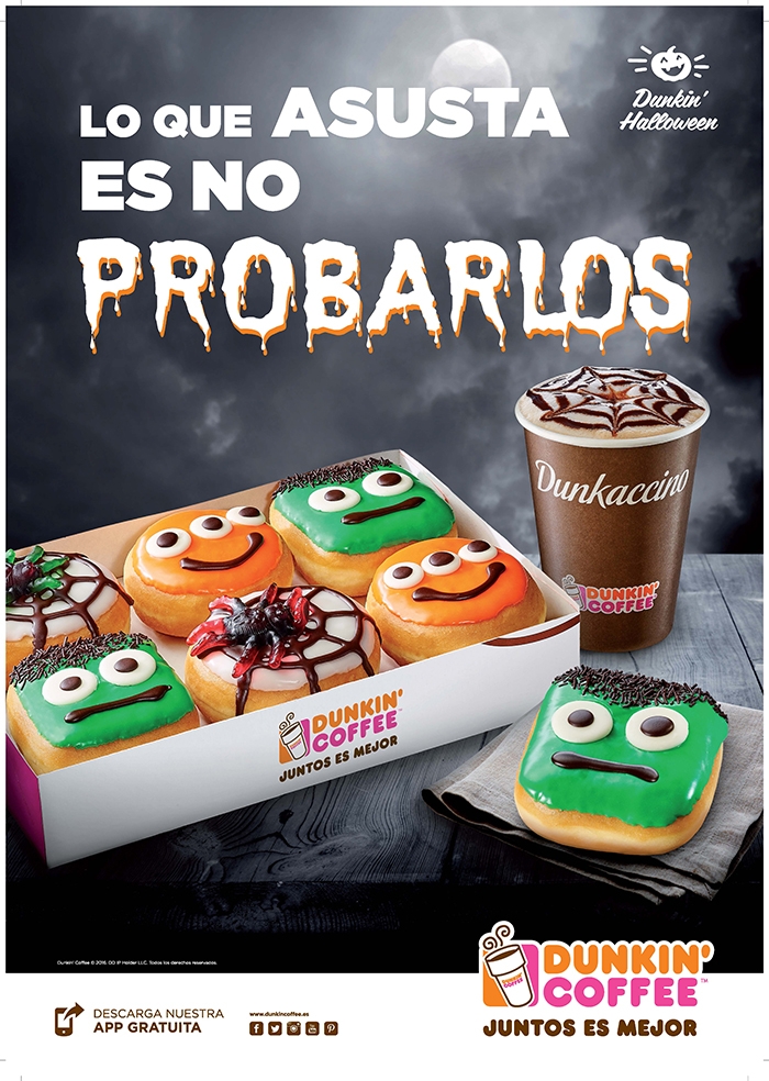 Bajo el claim “Lo que asusta es no probarlos”, la cadena ha presentado tres nuevas recetas inspiradas en los símbolos más emblemáticos de estas fechas: “Dunkin Frankenstein”, con forma cuadrada, relleno de crema bavarian y cubierto de icing de vainilla verde con virutas y sirope de chocolate; “Dunkin telaraña”, relleno de choco avellana y decorado con telaraña de chocolate y una araña de gominola, y “Dunkin Tres Ojos”, relleno de chocolate blanco y cubierto de icing de vainilla naranja y sirope de chocolate. Además, la bebida estrella de Dunkin’ Coffee, el Dunkaccino, también se podrá personalizar con siropes formando telarañas, con el fin de vivir un Halloween de lo más dulce.