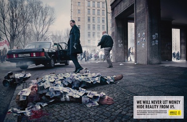 Quizá no todo el mundo lo sepa, pero Amnistía Internacional es una organización no gubernamental financiada, única y exclusivamente, con las aportaciones de sus numerosos socios. Y, dado que no acepta dinero de empresas multinacionales ni subvenciones de gobiernos, este movimiento puede presumir de ser independiente de cualquier estado, ideología política o credo religioso. Para dar a conocer este hecho TBWA París ha creado una impactante campaña gráfica que muestra muy gráficamente cómo el dinero jamás silenciara los mensajes de denuncia que lanza Amnistía Internacional: desde la situación de los "niños soldado" en África hasta los vertidos tóxicos de la industria en ríos y mares, pasando por los asesinatos de periodistas. La verdad no está a la venta.