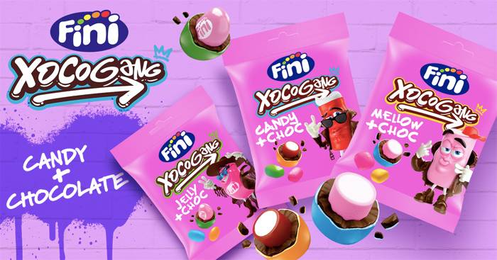 Fini Golosinas se adentra en una nueva categoría dentro del mundo de las golosinas y estrena XocoGang, golosinas bañadas en chocolate y cubiertas de diferentes colores. Este lanzamiento se presenta en tres referencias protagonizadas por personajes urbanos, llamativos y vestidos de chocolate. Fini Mellow + Choc es un marshmallow “rapero” recubierto de chocolate y cobertura de colores con una textura suave que hace que se funda en la boca; Fini Jelly + Choc son beans “festivaleras” con sabor fresa recubierta de chocolate y cobertura de colores consiguiendo la textura más chewy de todas; y por último Fini Candy + Choc, que es el clásico rellenito de fresa “más rockero que nunca” recubierto de chocolate y cobertura de colores.