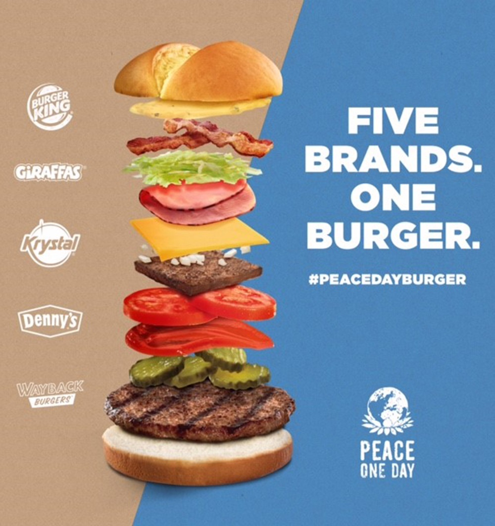 Lo que empezó como una oferta amistosa de Burger King Corporation a McDonald’s para aumentar la concienciación sobre el Día de la Paz, ha evolucionado hacia una alianza mayor. Después de que varias cadenas de restaurantes quisieran sumarse a la propuesta de Burger King para unirse y celebrar juntos el Día de la Paz, que tiene lugar el 21 de septiembre, se tomó una decisión sin precedentes y nació la hamburguesa Peace Day Burger.