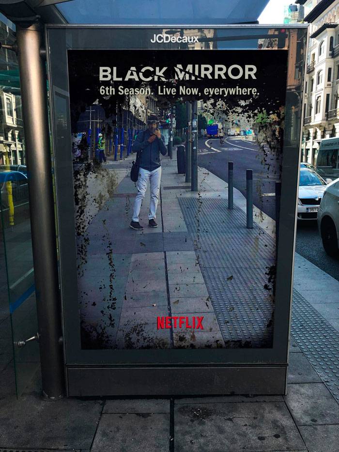 Hace ya unos meses nos deleitamos analizando uno a uno los capítulos de la quinta temporada de la serie de Netflix “Black Mirror”: desde las máquinas que rastrean la memoria de los testigos de un crimen hasta una solución tecnológica con la que vigilar a nuestros hijos para que no les pasa nada malo, pasando por unos robots infalibles y despiadados que cazan seres humanos. Pues bien, la sexta temporada ya se ha estrenado y está sucediendo en el mundo real. Así nos lo muestra está fantástica campaña de exterior con la que Brother Ad School España coloca a Netlix en la genialidad creativa.