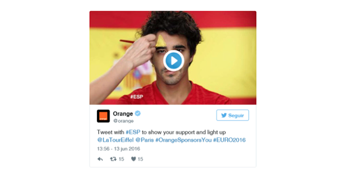 Orange invitó a los fans a tuitear apoyando a su equipo nacional, con el aliciente de que la Torre Eiffel se iluminaría con los colores del equipo que tuviera más apoyo en la plataforma cada día: