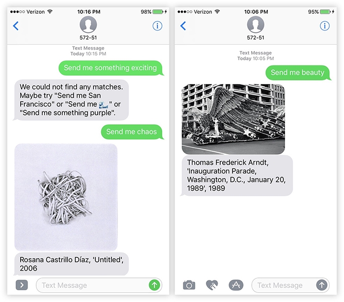 Este problema impulsó al Museo a crear una nueva manera de conectar con las personas para mostrar una gran parte de su colección. El resultado fue el programa “Send Me SFMOMA”, un motor de búsqueda que cualquier persona puede utilizar enviando un mensaje de texto y utilizando palabras y emojis para recibir obras de arte en su móvil.