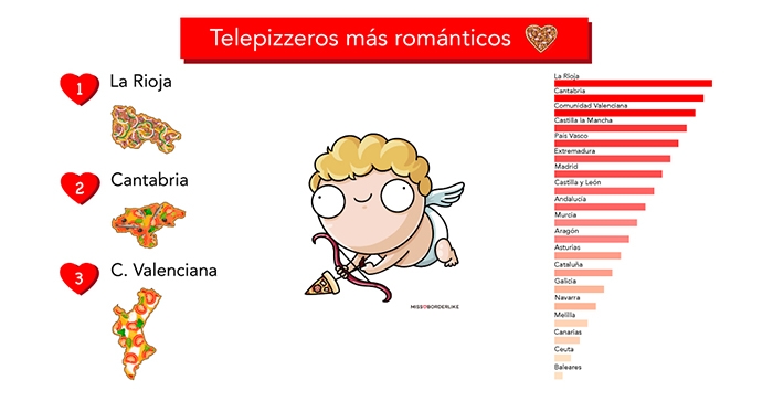 Con motivo de la celebración del Día de San Valentín, Telepizza ha elaborado el mapa de los telepizzeros españoles más románticos, que lideran los riojanos, los cántabros y los valencianos. Los baleares, ceutíes y canarios se sitúan a la cola del ranking.