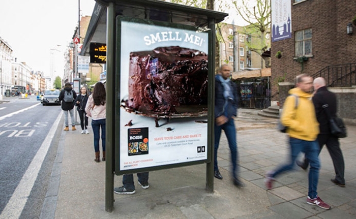 La agencia de medios MediaCom y la editora HarperCollins se han aliado para crear un anuncio de exterior con el fin de promocionar el nuevo libro de recetas de BOSH!, una plataforma desde la que Ian Theasby y Henry Firth dan a conocer los beneficios de llevar una dieta vegana. Para ello se han inspirado en una receta de tarta de chocolate a partir de ingredientes 100% vegetales, cuyo vídeo tutorial ha tenido un enorme éxito en la web Bosh! y sus redes sociales. Lo mejor de la creatividad, que ha sido instalada en una marquesina ubicada en la Goodge St. Station de Londres, es que ¡huele a chocolate! Y es que ya se sabe: el olfato es el sentido más poderoso y evocador.