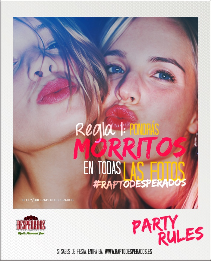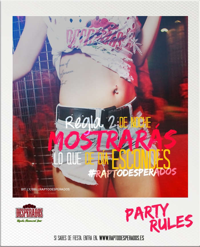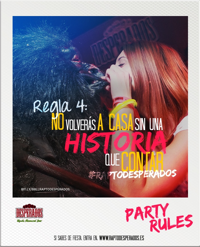 El próximo 24 de octubre, se celebrará en Madrid el último #RaptoDesperados del año. Para conmemorar estas fiestas Desperados presenta las #PartyRules: aquellas reglas de oro que los más fiesteros nunca se saltan. Estas #PartyRules serán las encargadas de definir quiénes serán los invitados a la fiesta; seleccionados esta vez por lo que hacen y no por lo que dicen, sólo vendrán aquellos que las cumplan.