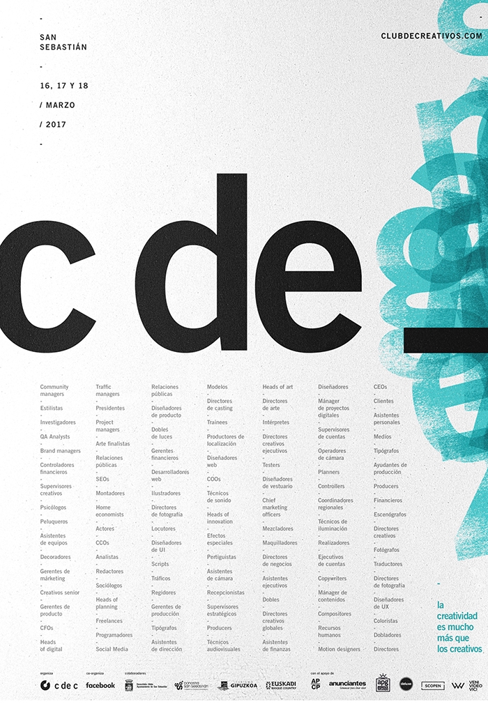 El Club de Creativos de España ( c de c) convertirá de nuevo a San Sebastián en el epicentro de la creatividad y de la comunicación los días 16, 17 y 18 de marzo. Con el lema “La creatividad es mucho más que los creativos”, el c de c 2017, co-organizado con Facebook con la colaboración de San Sebastián Turismo & Convention Bureau, quiere reconocer el trabajo de todos los perfiles profesionales que intervienen en la comunicación que se hace para las marcas.