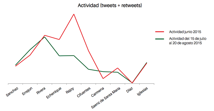 En general la actividad de Twitter de los políticos ha aumentado este verano. Esto se debe a que algunos perfiles, como el del Presidente de Gobierno, Mariano Rajoy, y la Presidenta de la Comunidad de Madrid, Crsitina Cifuentes, han incrementado notablemente su actividad en la red social durante los meses de julio y agosto. En la mayoría de los casos aumenta el número de retuits frente a los mensajes originales, especialmente los de las cuentas oficiales de los respectivos partidos.