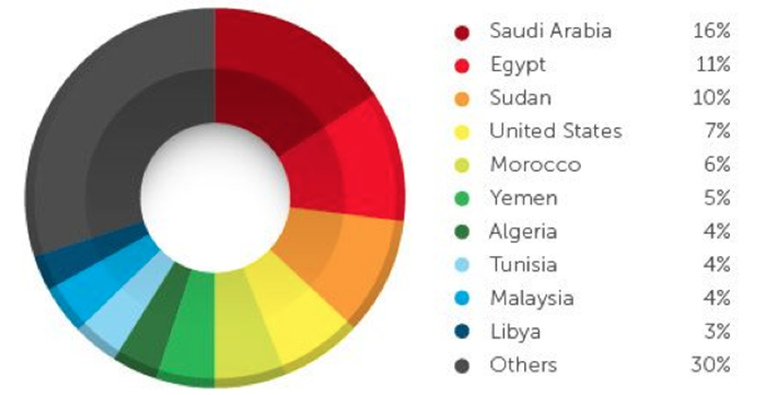 Los usuarios en Estados Unidos generalmente hacen clic en los enlaces que van a URL maliciosas de Twitter, ya se trate de Tweets "phishing", Tweets con URL acortadas, o spam tradicional. En una categoría, sin embargo, éste no era el caso. Identificamos un brote viral que fue dirigido a los usuarios en países de Oriente Medio. Usuarios en Arabia Saudita, Egipto y Sudán hacen clic en la mayoría de los enlaces de tweets que condujeron a malware. Estados Unidos fue sólo cuarto en este recuento: