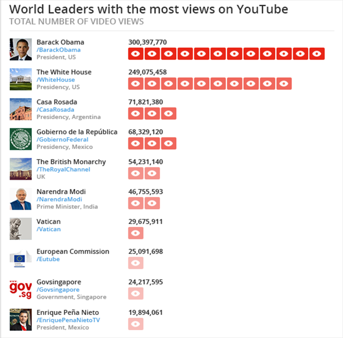 Desde que el presidente de Estados Unidos, Barack Obama (quien acumula el mayor número de suscriptores, más de medio millón), publicase el primer vídeo de un líder gubernamental en esta plataforma, más de 200.000 publicaciones de este tipo han tenido lugar en YouTube, acumulando más de 1.200 millones de visualizaciones. De los 193 países que conforman las Naciones Unidas, 148 tienen al menos una cuenta en YouTube, según señala el estudio de Burson-Marsteller.