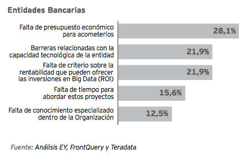 Sin embargo, a pesar de la imparable implantación de iniciativas Big Data y Analitycs, los encuestados perciben aún algunas barreras que las entidades poco a poco comienzan a superar. Las de tipo tecnológico continúan siendo un obstáculo para los consultados, 40,6%, al tiempo que las limitaciones presupuestarias pierden peso en la encuesta de 2015 respecto a la de 2014 pasando, sobre todo en el caso de las entidades financieras, del 28% al 11,8% en un año. Más ponderación ganan, sin embargo ahora, barreras como la falta de conocimiento especializado, para una 47,1% frente al 25% en 2014 y de criterio dentro de las entidades, que actualmente es del 23,5%.