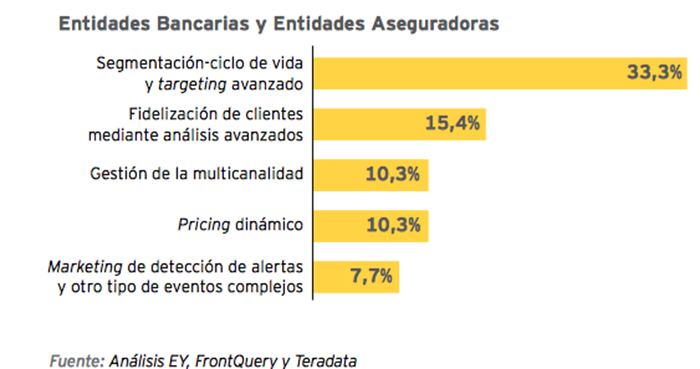 En lo referido a las aplicaciones percibidas por el conjunto del sector en este campo, un 33,3% resalta aquellas generadas en el área de la segmentación-ciclo de vida de sus clientes y en el targeting avanzado, traducidas en mayor rendimiento y eficiencia de las acciones comerciales. Además, aparece con fuerza, en la versión del informe de 2015, el scoring de riesgo y la valoración de carteras, sobre todo en las entidades financieras. Un 15,4% resalta la posibilidad de fidelización de clientes a través de análisis predictivos avanzados, lo que señalan en especial las entidades aseguradoras. Y a un 10,3% le resulta crucial la gestión de la omnicanalidad en un entorno donde las tecnologías multiplican los canales de comunicación y elevan la capacidad de transacción con las empresas y la información a compartir.