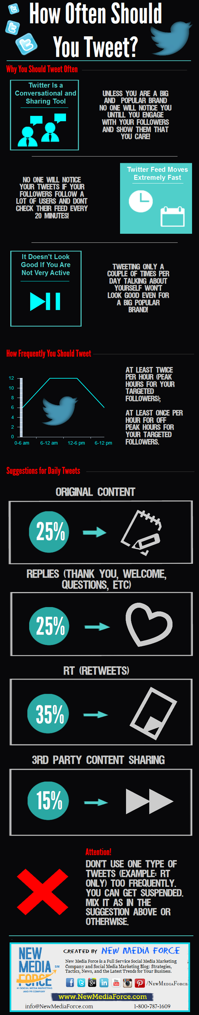 Una infografía desarrollada por New Media Force nos recomienda tuitear dos veces cada hora en los momentos de máxima concurrencia de nuestros seguidores.