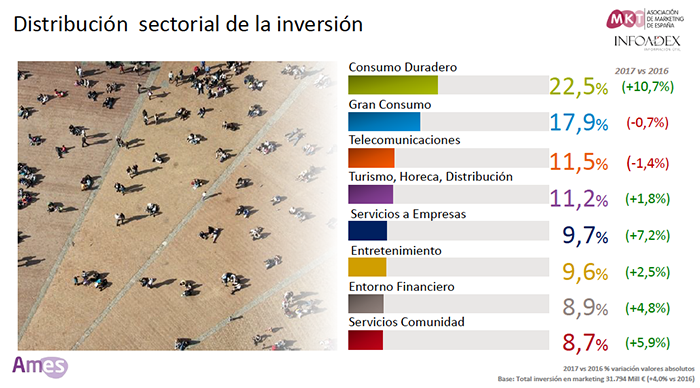 - Por sectores, la industria de Consumo Duradero acapara la mayor inversión, un 22’5 %, lo que implica un crecimiento de un 10’7 % frente a 2016. Le siguen, Gran Consumo, Comunicaciones, Turismo, Horeca y Distribución.