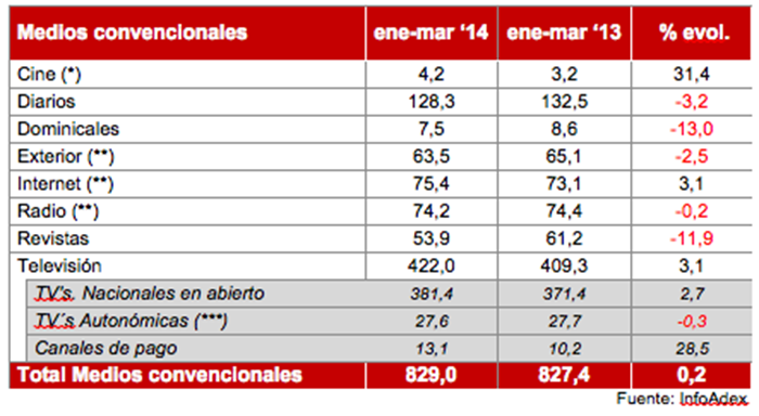 Infoadex ha hecho públicos los datos de inversión publicitaria correspondientes a los tres primeros meses del año y la situación empieza a ser esperanzadora para el sector. La Televisión, que sigue siendo el primer medio por su volumen de inversión, ha crecido un 3,1%, alcanzando los 422,0 millones de euros en el primer trimestre del año. Diarios, segundo medio por su valor absoluto de inversión publicitaria, ha sufrido en el período enero-marzo de 2014 una disminución del -3,2%, quedándose en una inversión de 128,3 millones de euros. El medio Internet (formatos gráficos), que ocupa el tercer lugar por su cifra de inversión, se sitúa en 75,4 millones, presentando un crecimiento del 3,1% sobre la cifra correspondiente del año anterior.