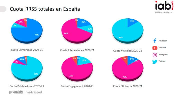 El IX Observatorio de Marcas de Redes Sociales, realizado por IAB Spain en colaboración con Gestazión y Metricool, recoge la actividad de 189 marcas en redes sociales dividida por sectores/categorías. La selección de las marcas y perfiles se basa en datos de volumen de inversión y categorización de sectores facilitados por adjinn para marcas con perfiles sociales destinados al mercado español con un periodo de análisis que se extiende del 1 de julio de 2020 hasta el 30 de junio de 2021. Las redes sociales elegidas para analizar cada una de las marcas son Facebook, Instagram, YouTube, Twitter, LinkedIn y Twitch.