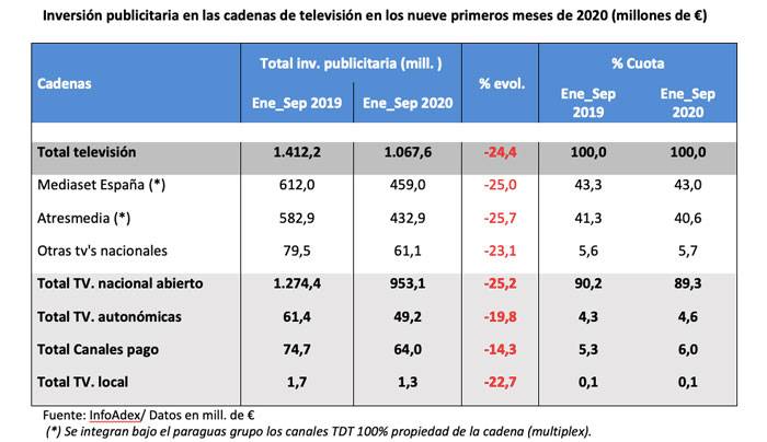 En los nueve primeros meses de 2020, la inversión publicitaria del grupo de las televisiones nacionales en abierto ha decrecido un -25,2%, alcanzando los 953,1 millones de euros, situando su cuota de mercado en el 89,3%. Mediaset España, con una evolución del -25,0% respecto al mismo periodo del año anterior, ha obtenido una cifra de 459,0 millones de euros, resultando una cuota de mercado del 43,0%. Atresmedia ha alcanzado una cifra de 432,9 millones de euros que se traduce en un descenso del -25,7% respecto a enero-septiembre del 2019, situando su cuota en el 40,6%.