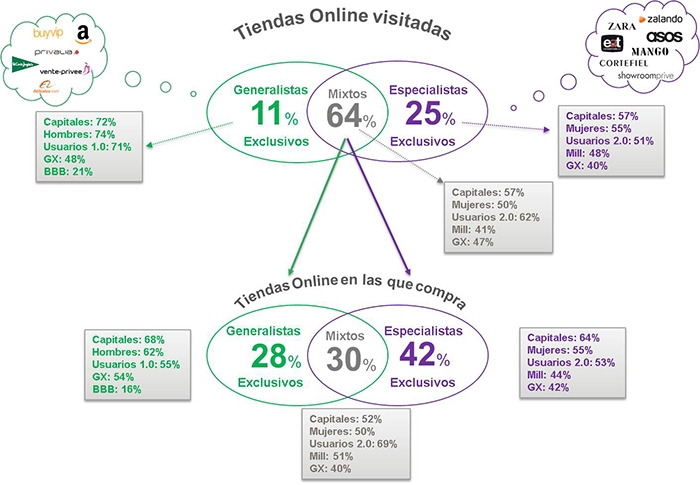 4. Desde el punto de vista de las compras, mientras el 42% de los e-shoppers solo compra en tiendas especialistas de moda, un 28% lo hacen exclusivamente en tiendas generalistas.