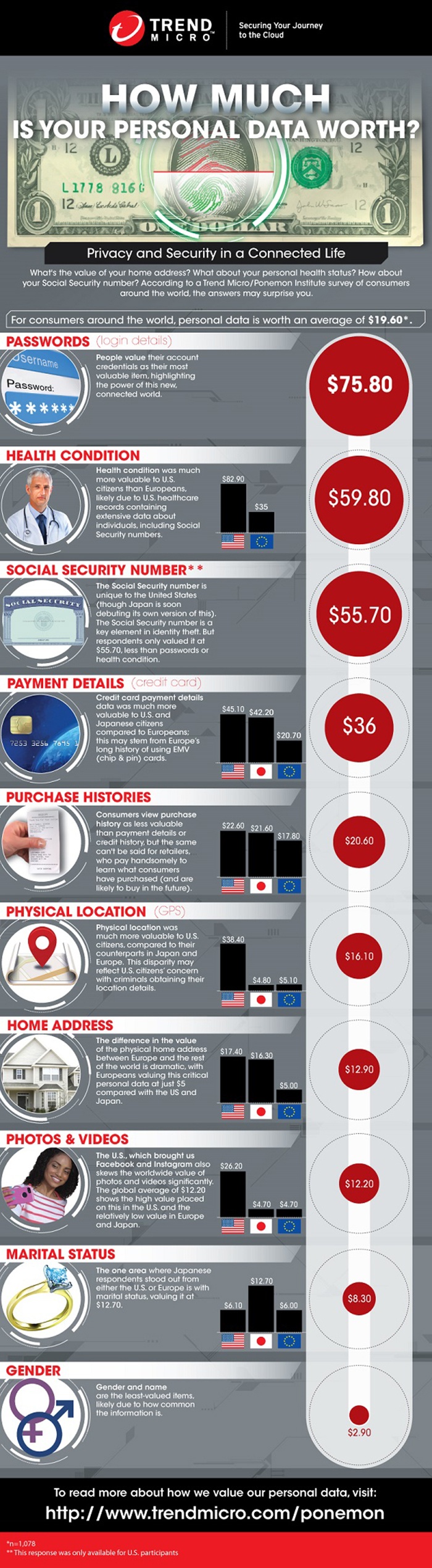 Si bien existen diferencias a escala regional en lo que al valor que se atribuye a cada fragmento de información, los participantes en el estudio creen que, de media, un dato vale 19,60 dólares. Los precios más caros son: