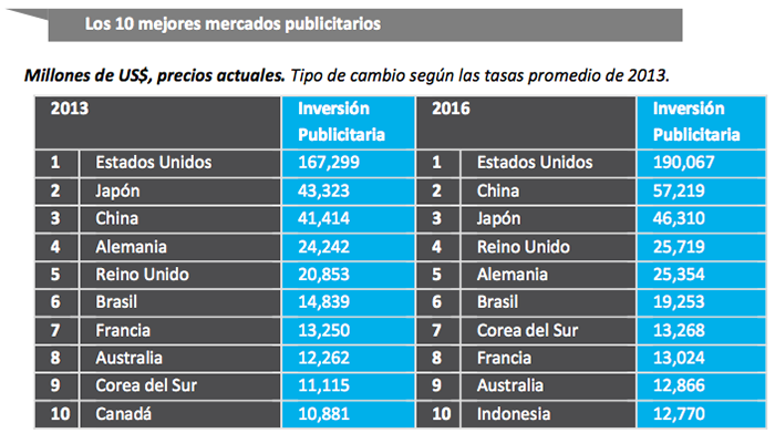 Indonesia era el decimotercero mercado publicitario más grande en 2013, pero está subiendo rápidamente en el ranking. Creemos que en 2016 podría ser el décimo, desplazando a Canadá, que caería a la onceava posición. También pronosticamos que Corea del Sur subirá de la novena a la séptima posición, desplazando a Francia y Australia cayendo cada una un puesto.
