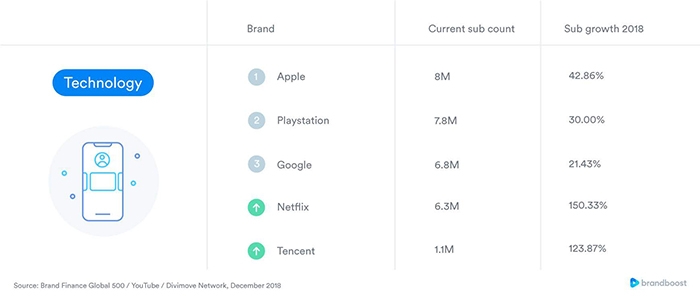 Los gigantes de la tecnología acumulan de media 740.000 suscriptores en sus canales de YouTube frente a los 950.000 de 2017. La marca con mayor audiencia es Apple (8 millones de suscriptores), por delante de la firma de videojuegos PlayStation con 7,8 y Google con 6,8. Los canales que más incrementan su número de abonados son Netflix -clasificada como plataforma tecnológica- (un 150,33% más) y Tencent (123,87%).