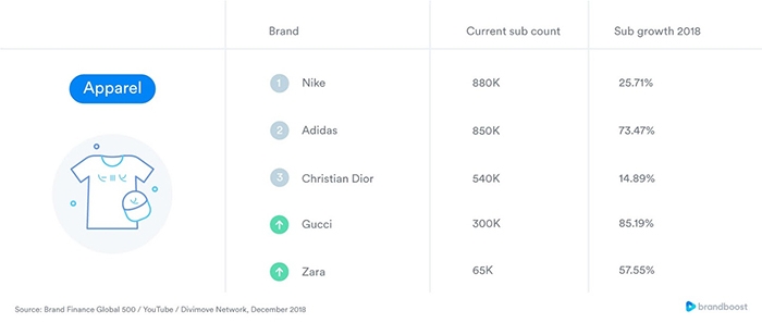 Con una media de 230.000 suscriptores por canal, la industria textil cierra este ranking con Nike a la cabeza (880.000). Le sigue muy de cerca Adidas (850.000) y un poco más lejos Christian Dior (540.000). Por último, los que más aumentan sus suscriptores son Gucci (85,19% más), Adidas (73,74%) y Zara (57,55%).