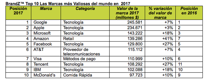 Según los datos aportados por BrandZ, ranking que combina entrevistas a más de 3 millones de consumidores con el desempeño financiero de las marcas, Google, Apple, Microsoft, Amazon y Facebook se sitúan en el Top5 de las 100 marcas más valiosas del mundo en 2017.