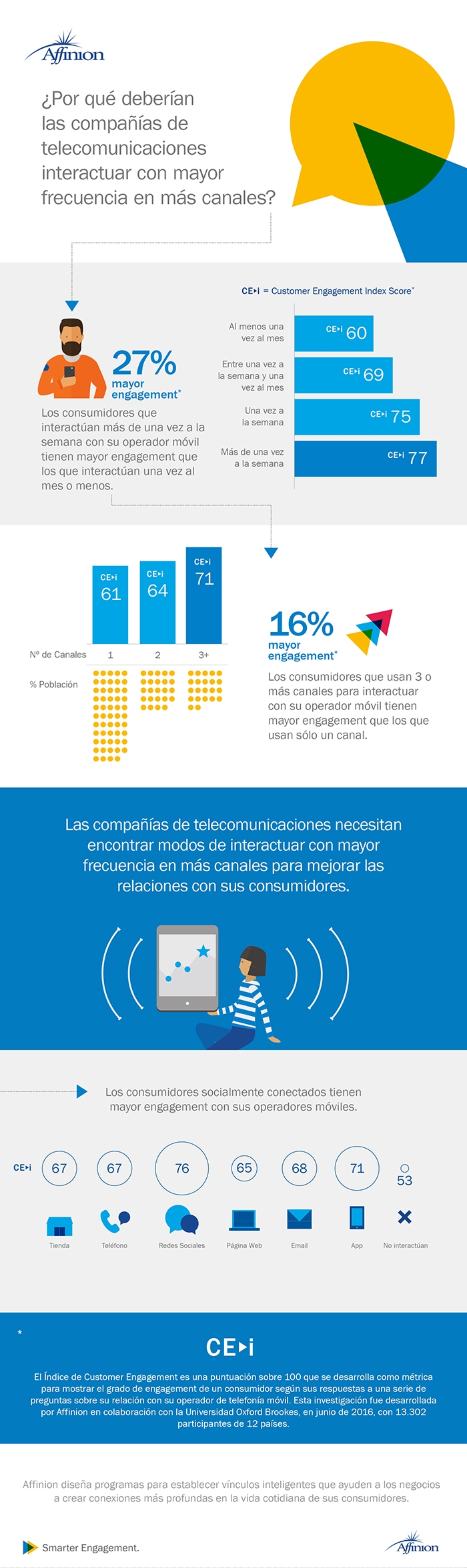 La frecuencia con la que el cliente interactúa con la empresa también es un factor clave. El estudio ha revelado que existe una relación directa entre la frecuencia de interacción de un consumidor con el número de canales que utiliza y la puntuación de engagement. En este sentido, los consumidores que interactúan más de una vez a la semana obtuvieron una puntuación de 77 puntos frente a los 60 de aquellos que lo hacen una vez a la semana. Este dato confirma la dificultad que tiene el sector para mantener el contacto de forma frecuente con sus clientes, ya que la mayoría de las veces que lo hacen es para consultar o tratar los problemas relativos a los servicios. Por eso, los operadores de telefonía móvil necesitan agregar puntos de contacto que capten al consumidor ofreciéndole motivos positivos para contactar con ellos.