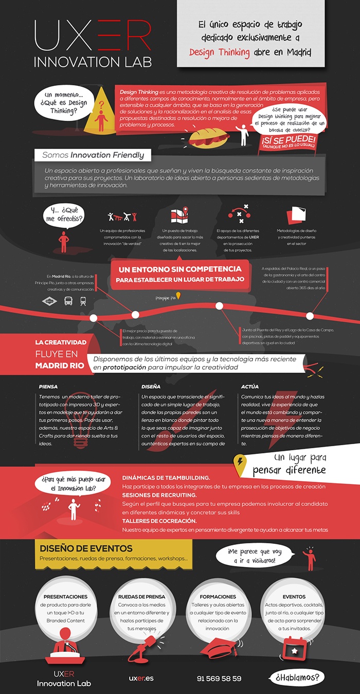 Esta década, sin embargo, será la del pensamiento lateral a través de las llamadas metodologías de Design Thinking , pensamiento creativo aplicado al diseño de productos y servicios que ya se usa en instituciones como el MIT o Harvard y que empieza a calar entre los profesionales de la innovación en España. En este sentido el Uxer Lab es el primer espacio de España diseñado para ello: una oficina con césped, paredes para pintar y talleres de impresión 3D donde puedes compartir tus ideas con otros profesionales para potenciar esa creatividad tan necesaria a la hora de plantear estrategias de negocio. “El objetivo es crear jugando”, señala Esteban García, director general de UXER, la consultora creada por Hydra Social Media, agencia de marketing digital que ya utiliza el Design Thinking en proyectos para clientes como Starbucks o Instituto de Empresa.