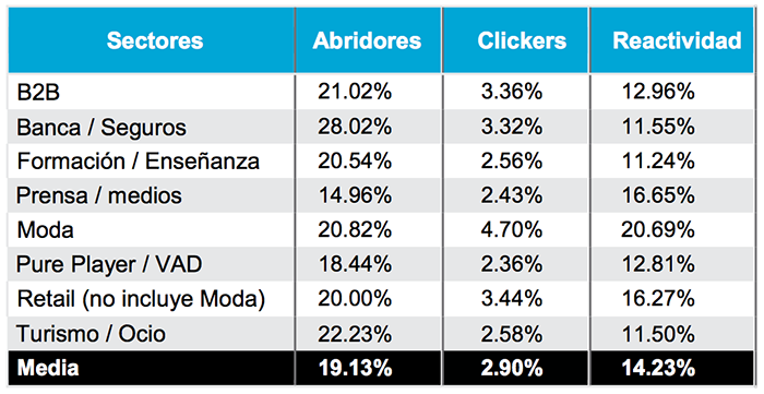 Cabe destacar que aunque la tasa de correos no entregados no sea un indicador del éxito de una campaña, sí muestra la calidad de las bases de datos que se están utilizando. Esto supone además un dato clave para las ISPs (Proveedor de Servicios de Internet) a la hora de valorar la reputación del remitente. En términos de aperturas, el índice español se sitúa en el 29,10% (frente al 29,76% del año anterior), con el sector Banca/Seguros a la cabeza del ranking (52,3%) seguido por las comunicaciones B2B (42,45%). En el otro lado de la balanza, Prensa/Medios de Comunicación y Pure Players se sitúan por debajo de la media nacional. El estudio confirma que en términos de aperturas resulta clave utilizar un asunto que genere interés en el destinatario. No obstante, conviene tener muy presente el objetivo de la campaña.