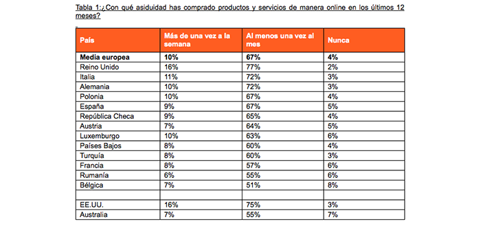 El 67% de los usuarios que efectúan sus compras en el territorio español realizan alguna transacción online de este tipo al menos una vez al mes. Este dato contrasta con el 51% de los consumidores en Bélgica, el 55% en Rumanía y Australia y el 57% en Francia. Además, el 9% de los españoles han comprado productos y servicios por canales digitales más de una vez a la semana en los últimos 12 meses.