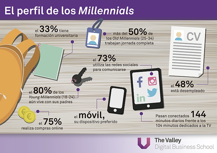 Según el estudio Consumer Connection System, realizado por Carat y dado a conocer por The Valley Digital Business School, de los Young Millennials (18-24 años) sólo trabaja el 10% a tiempo completo y el 80% sigue viviendo con sus padres. Por su parte, de los Old Millennials (25-34 años), más de la mitad tiene trabajo de jornada completa y el 63% está emancipado.