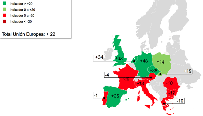 Sin embargo, en valores negativos se encuentra Francia, que sigue en una incertidumbre permanente, algo que se refleja en sus indicadores este trimestre, por debajo de Italia (-13), Portugal (-1) y Grecia (-10). En junio, las expectativas económicas de los galos alcanzaron -20 puntos.