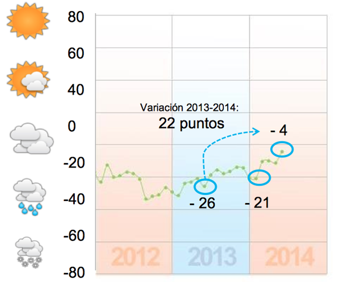 Estos datos son resultado en gran medida de las mejores expectativas económicas y la favorable evolución del empleo en el país. Las expectativas económicas alcanzaron en mayo 28 puntos, su mejor valor desde 2008. Y a pesar de un pequeño retroceso en junio de 3 puntos para situarse en 25, se trata de una mejora de 18 puntos desde principios de año y de 49 puntos en relación a junio de 2013. Este comportamiento demuestra que la confianza de los consumidores se va asentando lentamente, algo que también verifica el último Índice de Confianza del Consumidor publicado por el CIS (Centro de Investigaciones Sociológicas).
