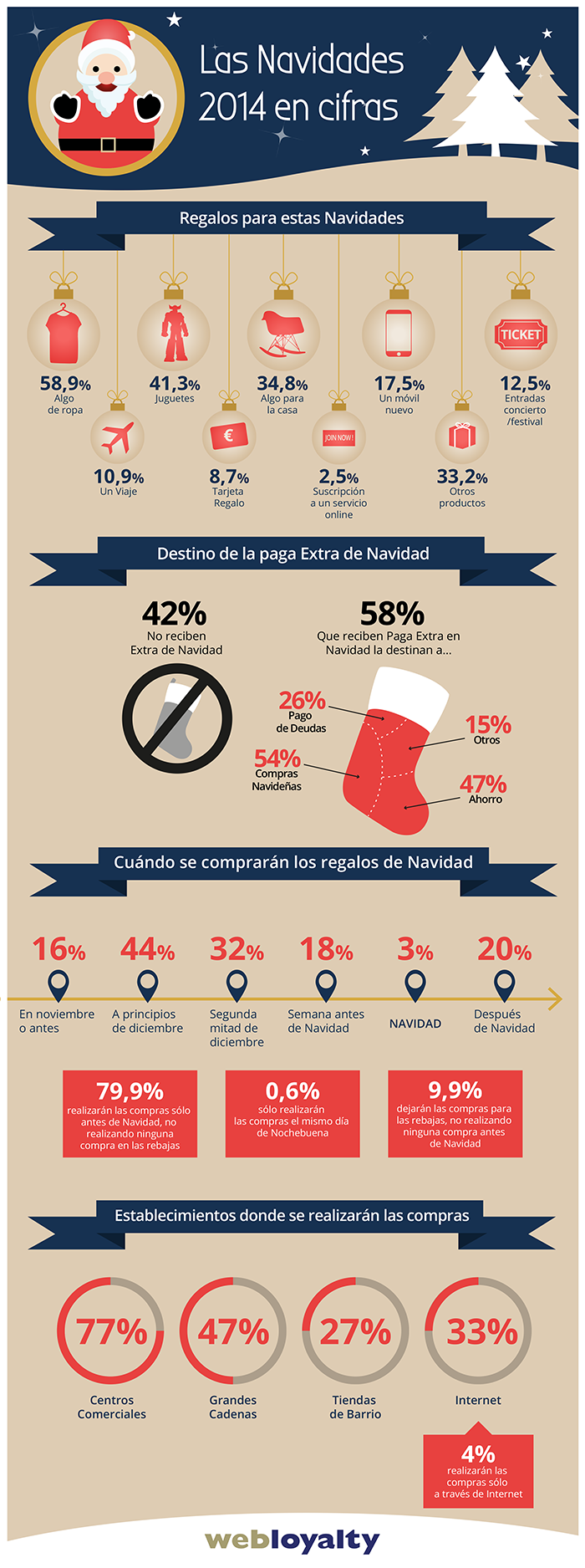- La mayoría de las compras navideñas se realizan en centros comerciales tradicionales con un 77%, en las grandes cadenas el 47% y en las tiendas de barrio, un 27%. Asimismo, el 33% de los entrevistados prefieren hacer sus compras navideñas a través de Internet.