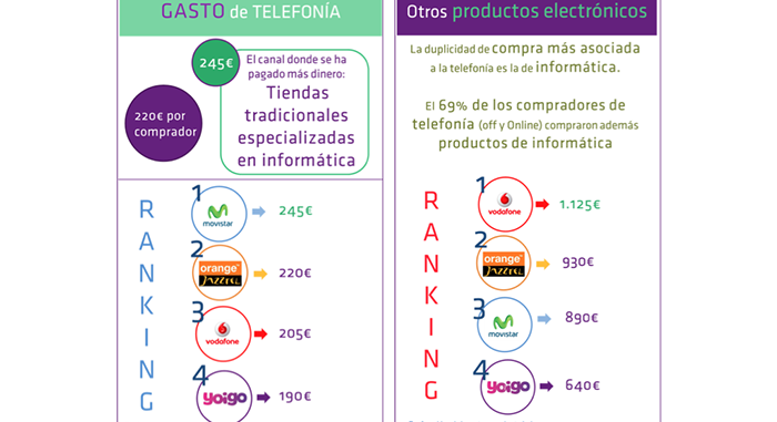La duplicidad de compra más asociada a la telefonía es la de informática. Algo más de dos de cada tres (69%) de los compradores de telefonía (off y online) durante 2016, compraron durante el año, además, productos de informática. Los abonados a Movistar son los que más compra cruzada muestran. El ranking de operadoras en función del gasto total en electrónica en 2016 (excluido el terminal telefónico) es muy diferente al obtenido en función del gasto en terminales que hacían sus abonados. Así, los abonados a Vodafone lideran el gasto en electrónica (1.125€), seguido de los de Orange/Jazztel (930€), de los de Movistar (830€) y finalmente de los de Yoigo (640€).