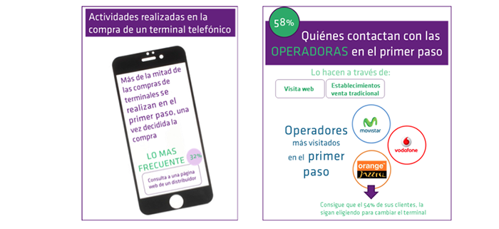 Lo más frecuente en el primer paso, una vez decidida la compra, es obtener información de la web (40%), principalmente del distribuidor que no es operadora, y la visita a un establecimiento de comercio tradicional (35%), principalmente de una operadora telefónica. Cuando la compra se materializa, el modo más frecuente es la tienda tradicional (50% de las compras, siendo más habitual las tiendas de distribuidor que de operadora).