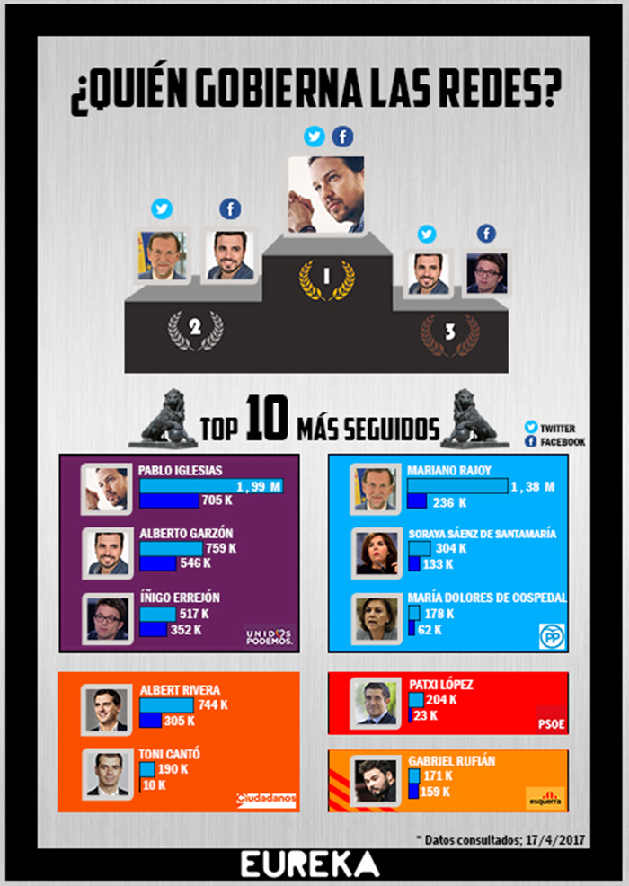 Las redes sociales son el nuevo foro donde los políticos y sus partidos hacen campaña a diario, abordando varios de los temas más candentes de la actualidad. Siguiendo esta línea y dada la importancia de estas plataformas como instrumento político, el equipo de Eureka PR ha elaborado un ranking que agrupa a los diez políticos del Congreso de los Diputados con mayor número de seguidores en Twitter y Facebook.