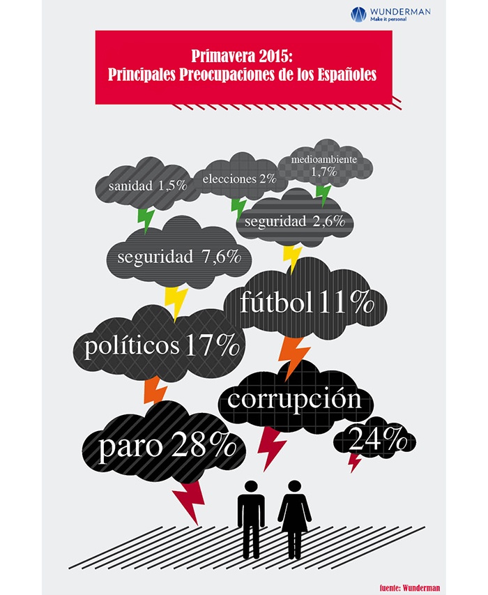 Según los datos recogidos gracias a las potentes herramientas de escucha, análisis semántico y reglas automatizadas de Wunderman, se observa cómo ocupan una posición destacada en el pódium de temas más relevantes para los españoles el Paro (28,1%), seguido de cerca por la Corrupción (24,1%) y completando el podio, los Políticos (16,7%). En cuanto al resto de temas que más comentarios generan los españoles se encuentran el Fútbol (11,3%), la Seguridad (7,6%) y la tragedia de protagonizada por la aerolínea Germanwings (2,6%).
