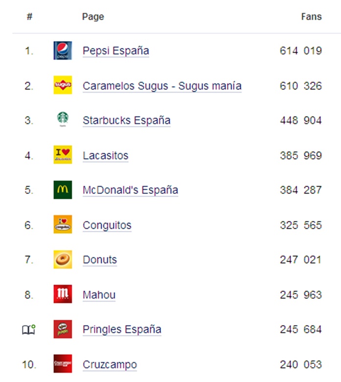 Según datos de Socialbakers, los 614.000 fans de Pepsi en Facebook sitúan a la marca de colas en cabeza del sector Alimentación y Bebidas en España, por delante de Caramelos Sugus (2º lugar), Starbucks España (3º) o McDonald's España (5ª).