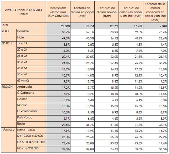 AIMC (Asociación para la Investigación de Medios de Comunicación) ha presentado los resultados de su sexto estudio realizado a través del AIMC Q Panel, su propio panel de internautas en desarrollo, en el que se muestran los hábitos de los internautas en relación al consumo de prensa diaria. Este estudio, el segundo que se ha realizado este año sobre este tema, tiene como objetivo profundizar en el conocimiento de los individuos que leen prensa y acceden a Internet. Todos los participantes en el estudio han sido contactados a través de un cuestionario online que comenzó el pasado mes de junio.