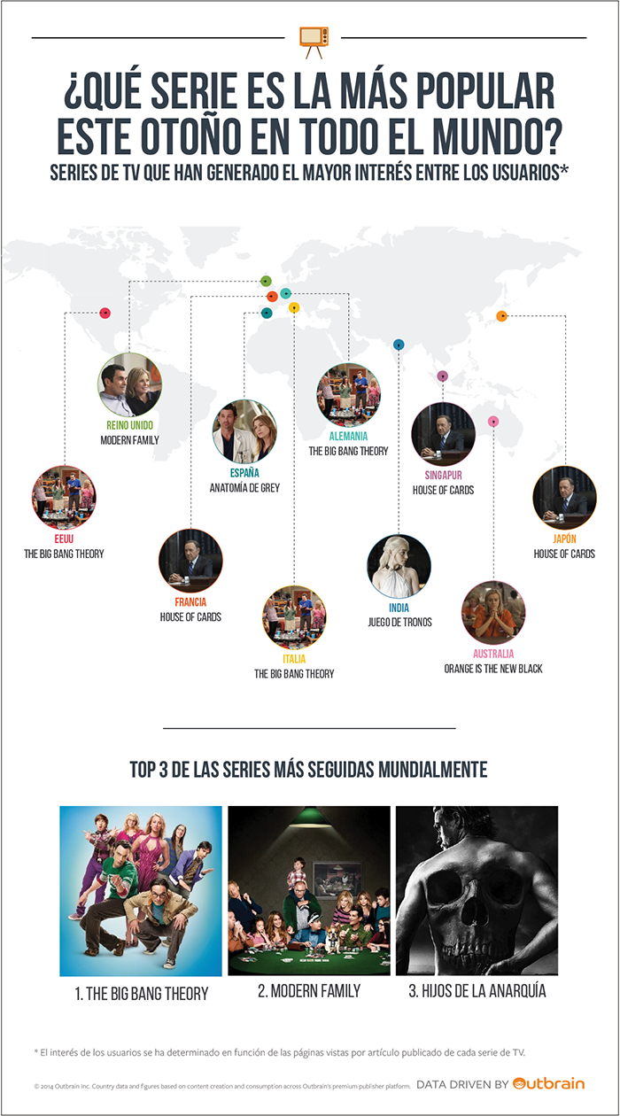 La primera conclusión extraída de esta investigación es que The Big Bang Theory, Modern Family e Hijos de la Anarquía son las series de TV que más interés despiertan en todo el mundo ostentando el mayor número de páginas vistas por artículo publicado.