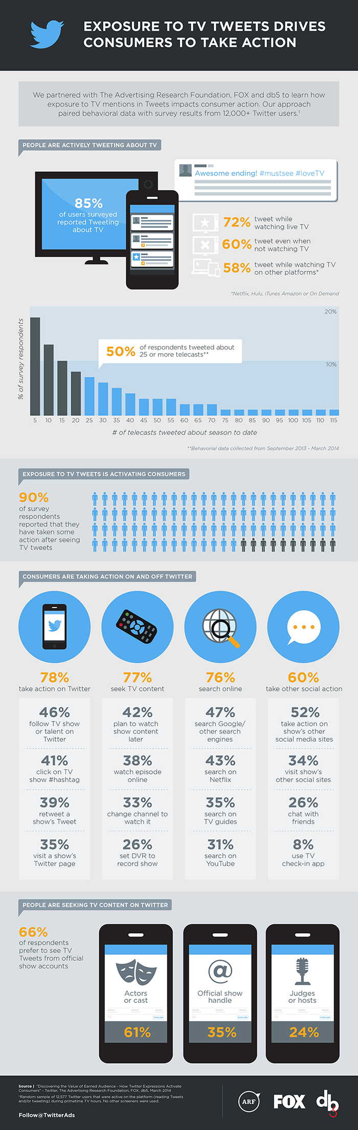 El 99% de los usuarios de Twitter está expuesto a estos tuits relacionados con la televisión; y cuando los leen, el 90% de ellos suele responder viendo el programa, aunque nunca lo haya visto antes; volver a verlo cuando había dejado de seguirlo; y/o buscar más información online sobre el programa en cuestión. De hecho, un tercio de estos usuarios cambia de cadena para ver el espacio televisivo tras leer los tuits que hablan sobre él.