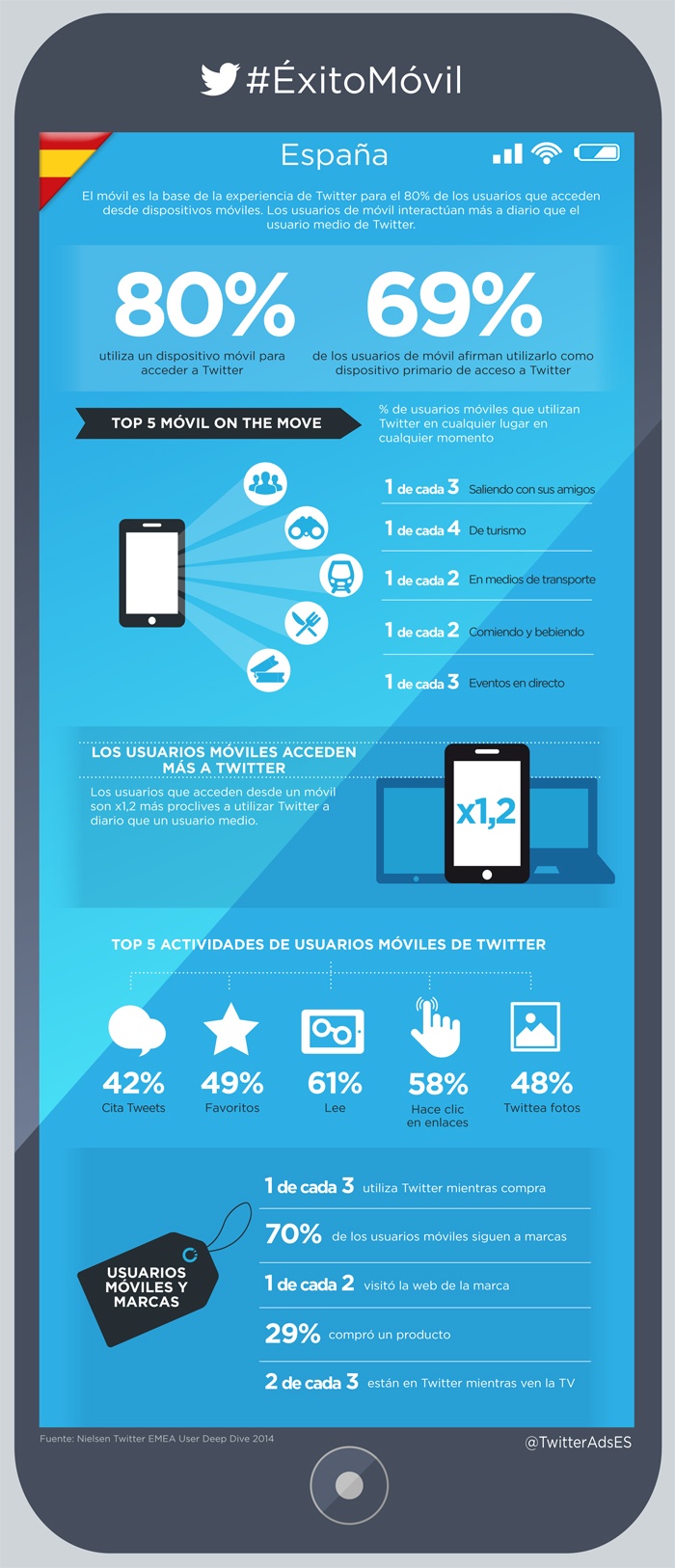 Según un reciente estudio de Nielsen, el 80% de los usuarios españoles utiliza el móvil para acceder a Twitter y la mayoría asegura que el móvil es básico en la experiencia Twitter.