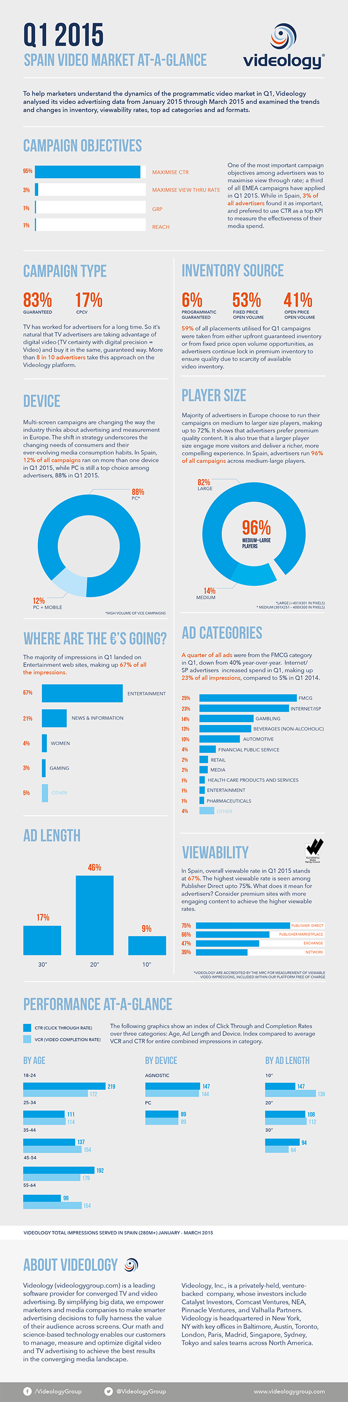 Según el análisis de Videology sobre el uso de su plataforma durante los primeros tres meses de 2015, sólo el 12% de todas las campañas de publicidad de vídeo online en España se realizaron para PC y dispositivos móviles. En España, las campañas específicas para PC siguen manteniendo su hegemonía, y el 88% del total se realiza sólo en este entorno.