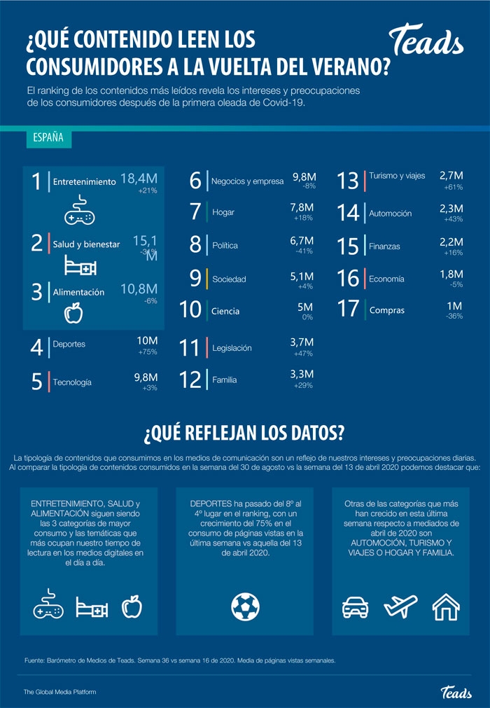 Desde enero de 2020 Teads está monitorizando el tráfico en su plataforma, que incluye a los principales grupos editoriales en España, entre los que se encuentran Unidad Editorial, El Confidencial, Hearst, Público, Condé Nast y Blue Media. Entre marzo y abril de este año, los contenidos más consumidos en volumen de páginas vistas tenían relación con la salud y el bienestar en primer lugar, seguido de lo relacionado con la legislación y las instituciones y, por último, la alimentación y recetas de cocina.