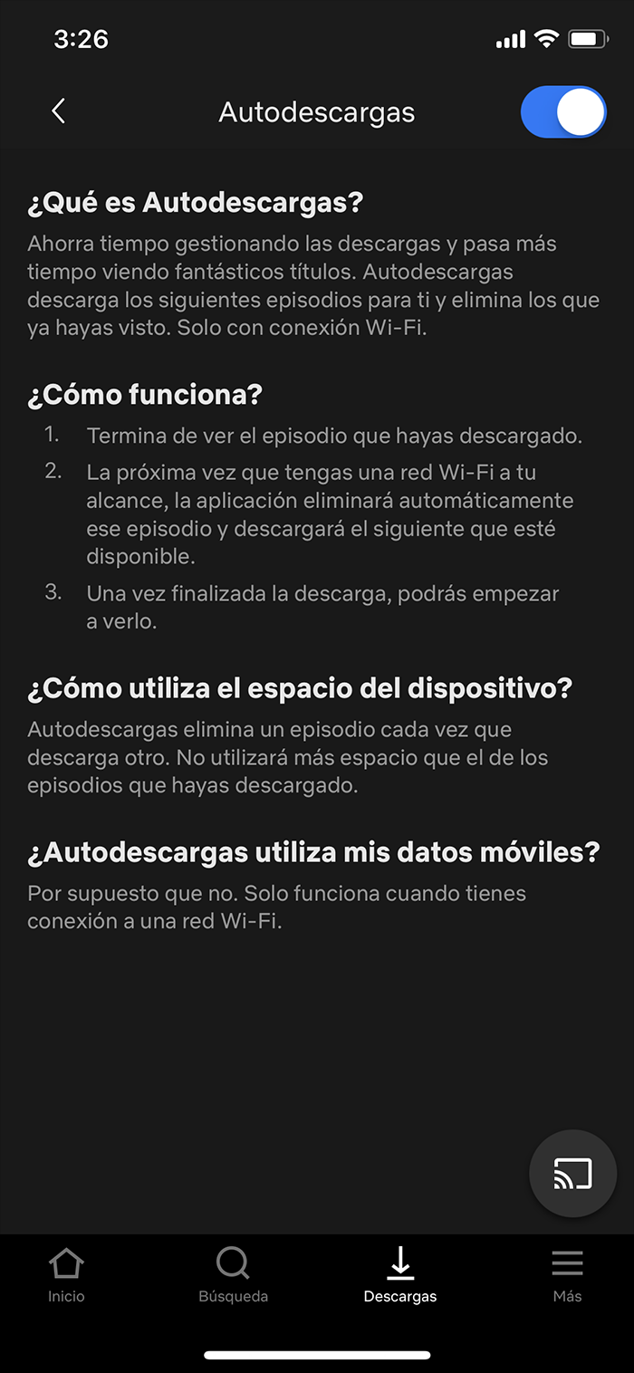 Cuando termines de ver un episodio descargado en tu aplicación de Netflix para iPhone, Smart Downloads descargará automáticamente el siguiente episodio y borrará el que acabas de ver la próxima vez que te conectes a Wi-Fi. Tú disfrutas de tus contenidos, y Netflix hace el trabajo.